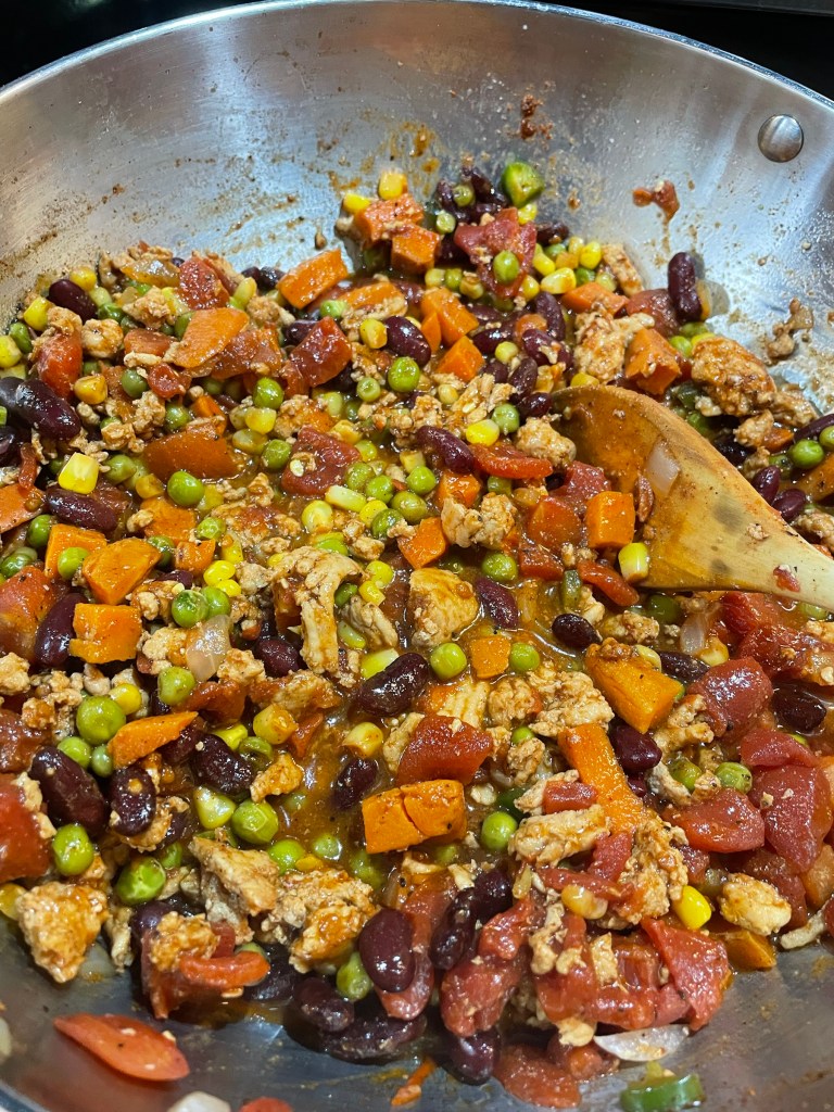 Cook the meat/onion….then basically stir in everything else until done. Serve over leftover rice and mix together.