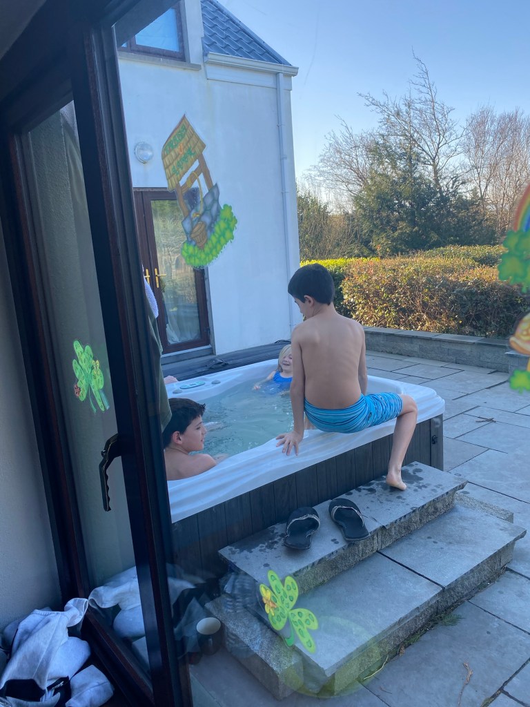 In the morning, the kids soaked up time with their little cousins in the hot tub: