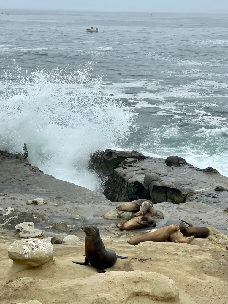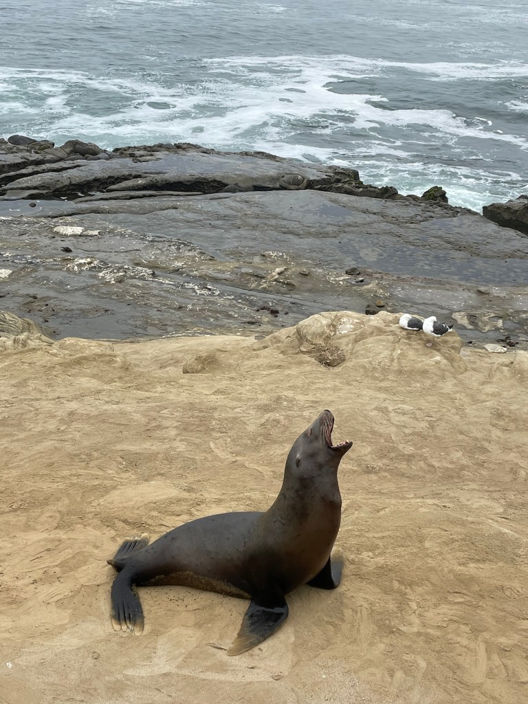 Eventually we made our way to the actual La Jolla Cove and the “Children’s Pool” area- where the seals and sea lions love to hang out. We could hear them before we even saw them. They were scattered all along a huge stretch- and there were a LOT of them!!!