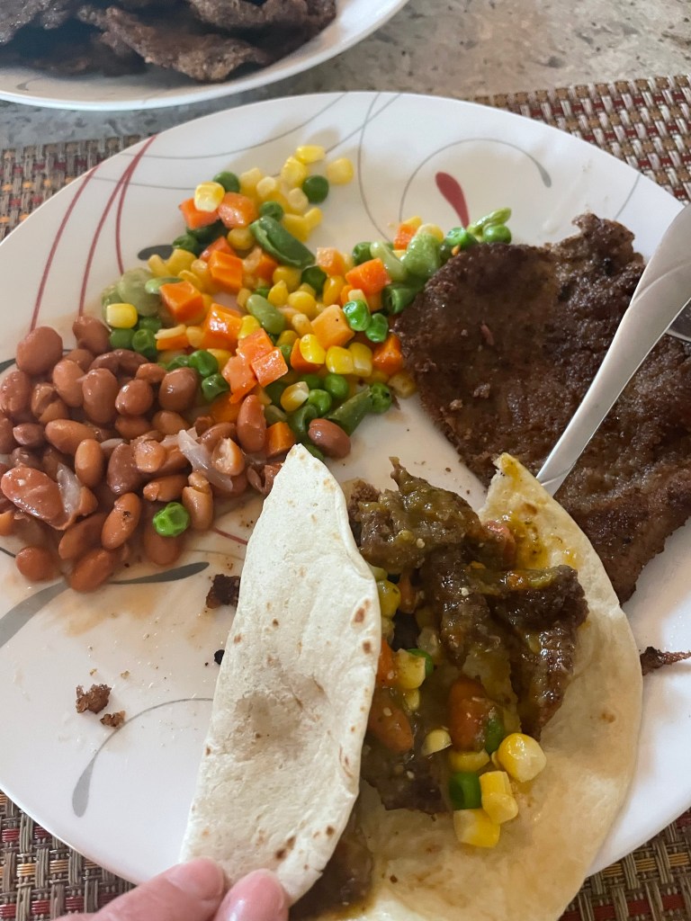 I made milanesas, which are a very thin cut steak that I hand breaded and fried. On the side we had pinto beans cooked with some onion, and because I was trying to hurry and it was easy, some frozen veggies.