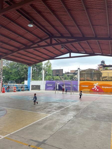 Well, we didn’t quite time that right… it started to pour after only a couple minutes. Ugh!!! We walked as far as we could while the rain was light, but eventually we had to duck into a covered basketball court area to wait it out a bit.