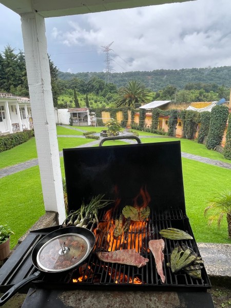 YUM this was so good. Steak over a wood fire, nopales, cebollines, beans and fresh tortillas. And salsa. 😋