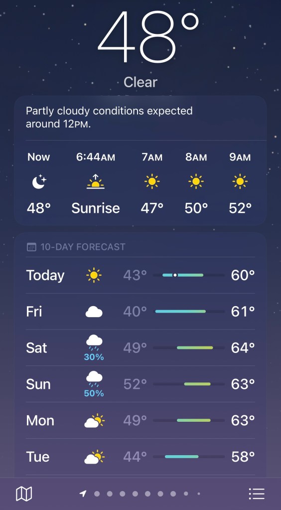 It’s officially fall today! The weather is taking a sudden dive precisely on the Autumn Equinox here today- it was 85 on Monday, and here is the current temp and forecast: