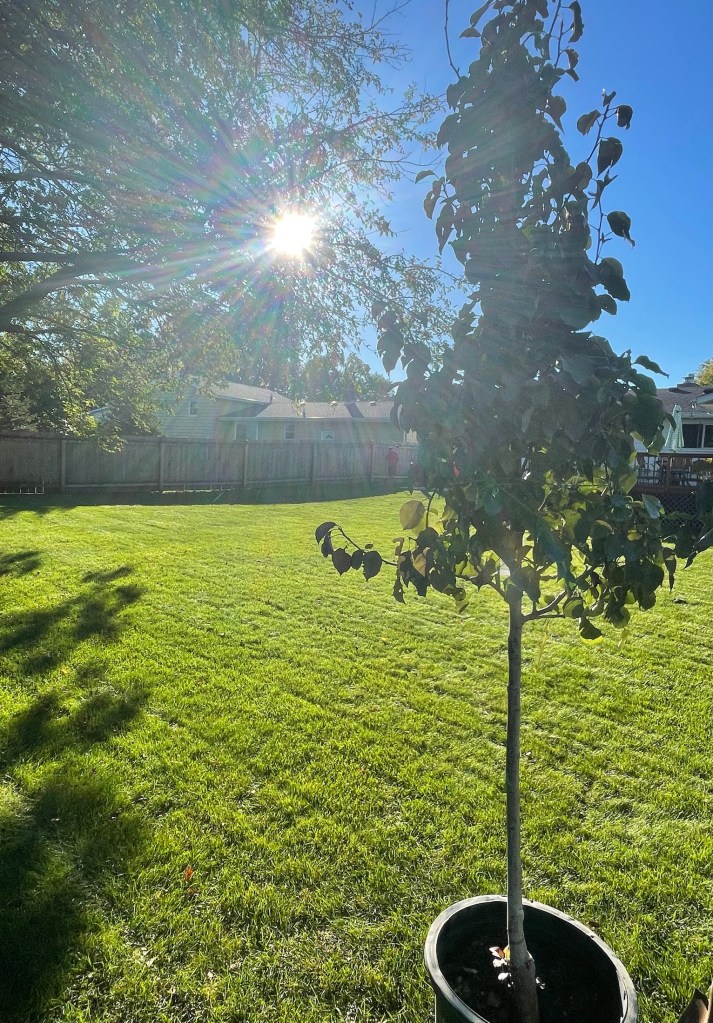Besides that, the big event of the weekend is that we planted a new tree!! Yay! I’d been wanting to get one in the ground in this opening in our back yard, but we kept stalling. Finally I made the wheels turn and this happened (just in the nick of time, because winter will be coming soon….) My Dad came to pick up my mom and helped Ivan haul the tree and dig the hole, etc. I supervised. 😉