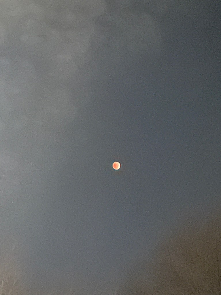 #3: Ethan and I woke up at 4:40 a.m. to see the lunar eclipse. He heard about it on the news and REALLY wanted to see it, so he set an alarm. We went out on the front lawn, and yep, we saw it! It was neat. A very strange shadowy red color. I took a picture. My iphone is good, but it’s still not a telescope. Maybe that will be the iphone 15.