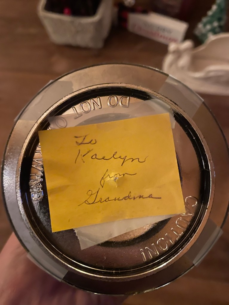 I am grateful for this silver Christmas tree music box from my grandma. It was hers, but before she died, she labeled it to be given to me. I had a music box collection growing up, so it was fitting that it would go to me. Every year when I pull it out, I love to flip it upside down and see her handwriting on the bottom. I taped the sticky note on years ago because I never want to lose it!