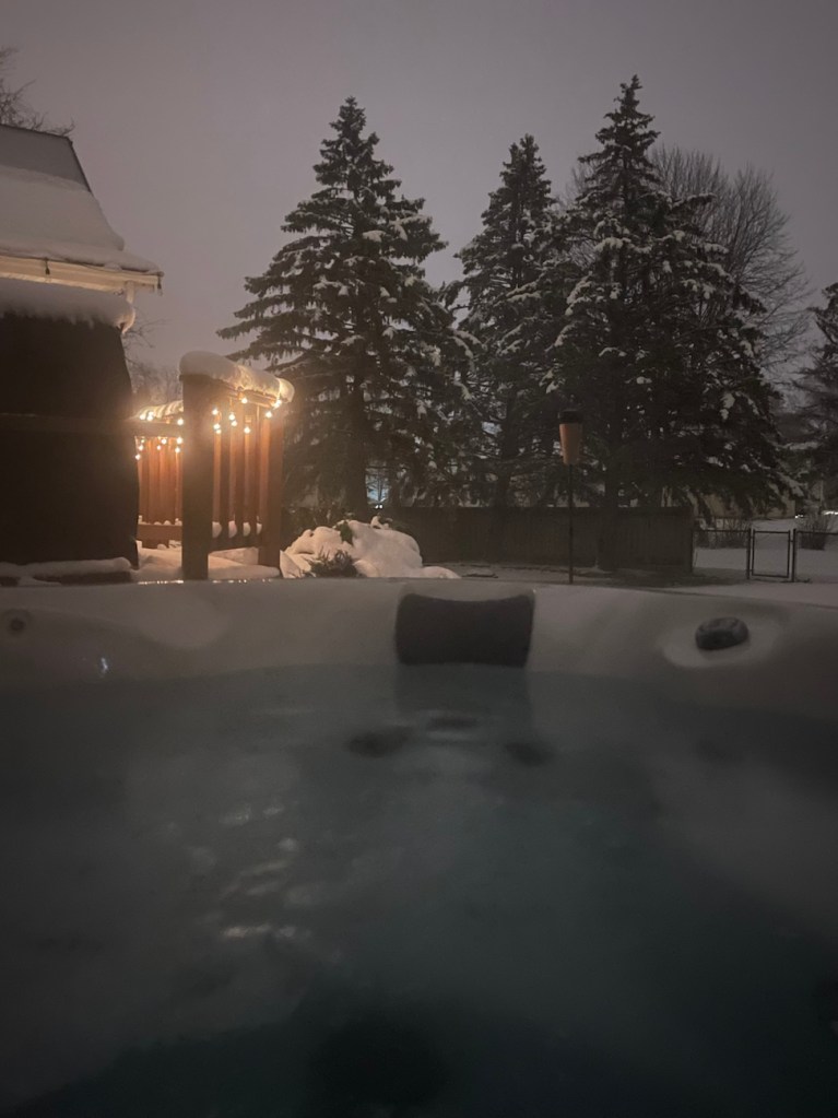 Wow you got a fair amount of snow. The hot tub sounds fun while everything around you is covered in snow 🙂