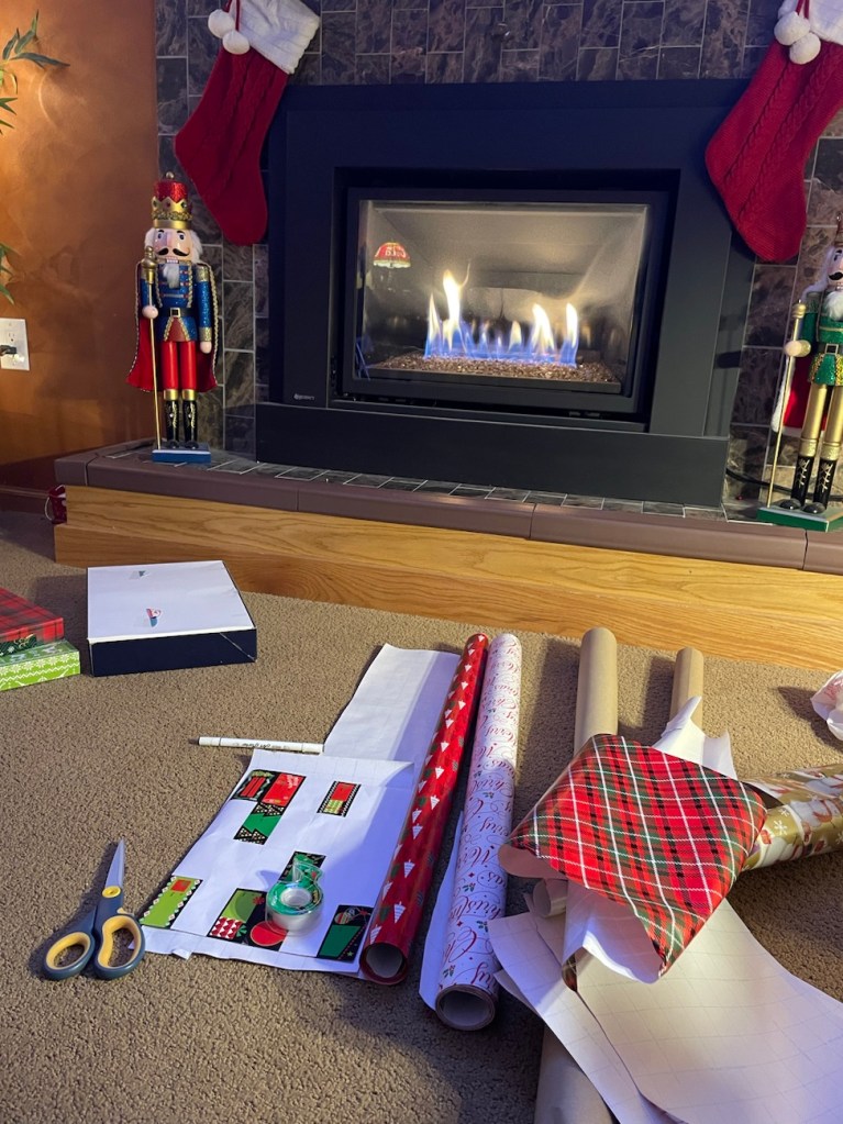 - Also, I did a bunch of gift wrapping yesterday, which I generally enjoy. I put on some Netflix Christmas movies and sat on the floor by the basement fireplace. Festive!