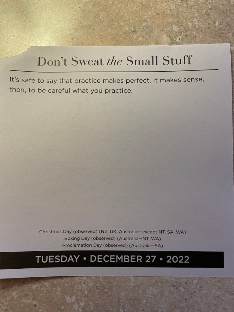 “Be careful what you practice”. That’s good! Am I going to practice healthy habits, healthy thoughts, a healthy lifestyle? Or am I going to practice being crabby, stressed, and eating junk? Practice makes perfect, and I probably don’t want to become perfect at those last three. 😉