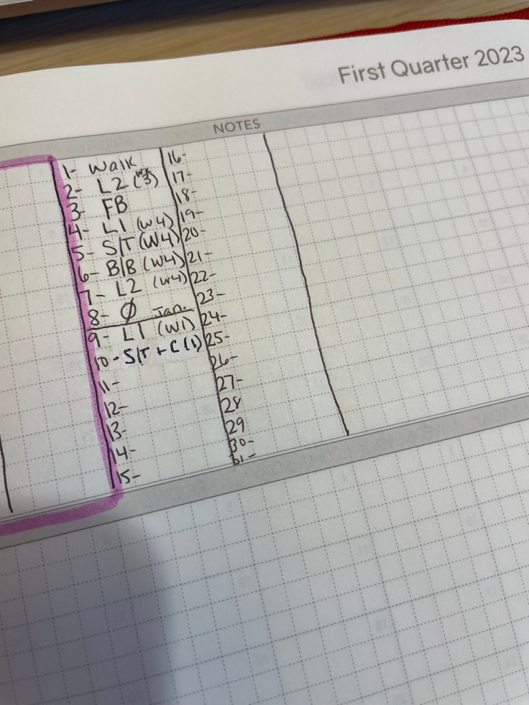 • Tracking the basic workouts I did each day in my highlight journal/ daily page. (I just write, for example: “workout: Lower #1 (Week 1).