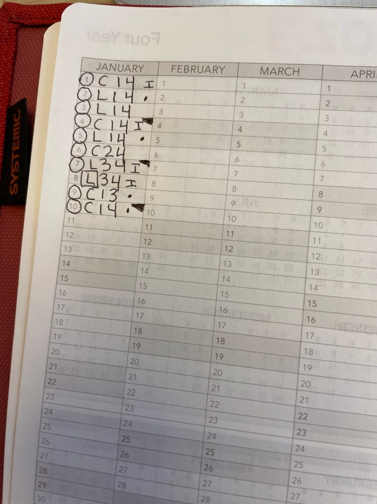 I track multiple things here- it’s a secret code system. 😉 The circles around dates are strength/cardio workouts, and the dot= outside walk, I= inside walk.