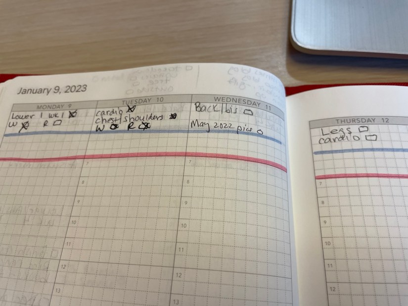 I don’t do much in terms of tracking my workouts. I use the gantt pages in the W222 and put a checkmark on the days I workout. I consider a workout running or a strength training workout. I do not consider walks, even super long walks, a workout, though. I also started to track the number of miles I run, although the total is going to be so depressing because I’m only running 3 miles typically. Which is FINE! I have to block out what my mileage used to be so as not to beat myself up internally over how little I am working out.