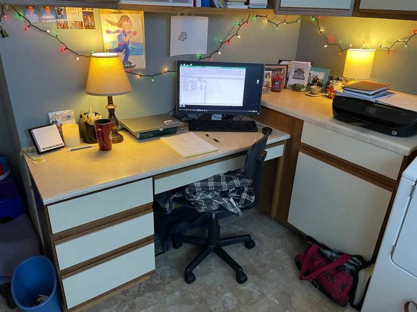 After the meeting, spent some time trying to reconfigure my desk set up. Long story, but basically, I used to keep my laptop off to the side, on the raised countertop to the right. I liked it out of the way. But my camera is on the laptop…. so for on camera meetings, I always have to look at the laptop. And the screen is kind of small! So if they are presenting, etc., I tend to drag whatever is on the screen to my monitor (so it’s nice and big)… but my camera is still on the laptop, off to the side. So if I’m looking at the monitor, then everyone else is looking at the side of my head, basically. Or if I have to present something, it’s just awkward to not be looking at the people. ANYWAY. So I rearranged all the cords and now will just keep my laptop straight in front of me, so I can look at both it and my monitor without much “head movement”. lol.