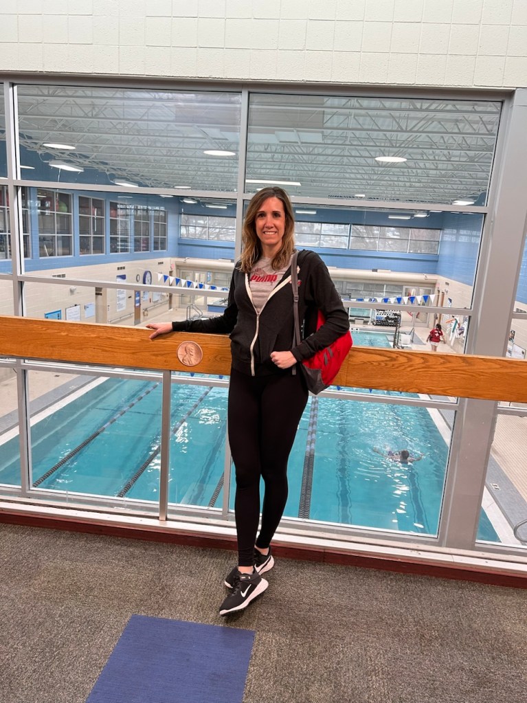 The pool. It’s a 50 meter pool, divided into 2 halves to make two 25 yard pools (this is short course season, so they swim the 25 yard length right now.)
