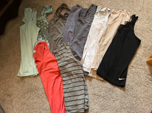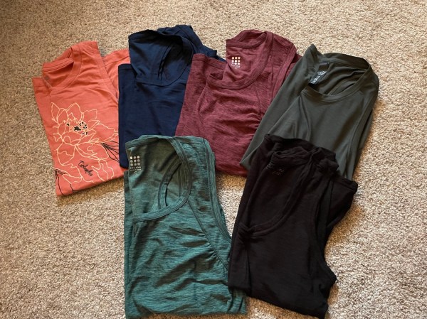 These other shirts are either “nicer” tank tops (potentially could wear to casual dinner, whereas most of my other tank tops are more like sporty/hiking/adventuring variety), or what I would consider a “top”, or just a less sporty tank top. I also have 1 3/4 length sleeve shirt here, and 2 lightweight long sleeves. (And one non-athletic denim pair of shorts).