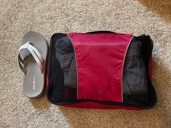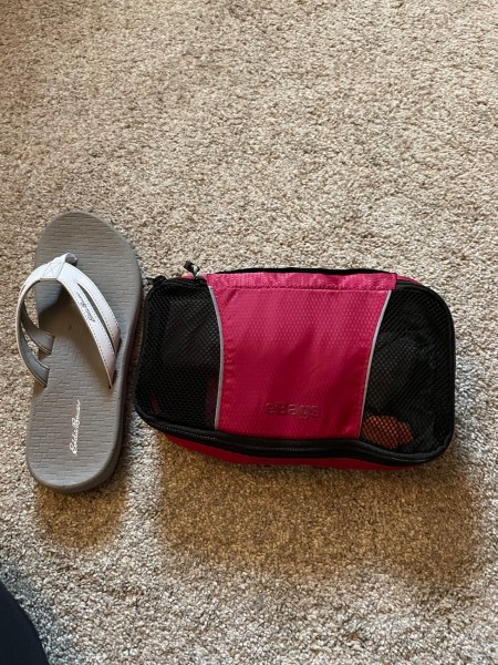 Besides the hiking sandals in the front pocket, these flip flops are the only shoes in the bag. I am wearing my sneakers/hiking shoes.