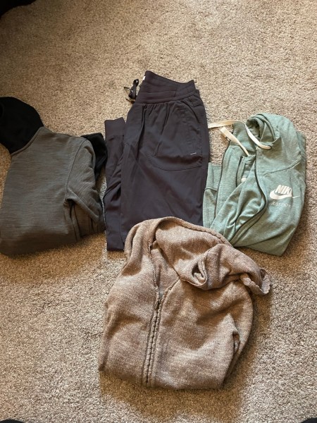 I packed a medium weight Columbia sweatshirt (top left) which goes with almost anything. In the middle are my LL Bean joggers which are SUPER lightweight. Far right top is a lighter weight hoodie- good for if it’s hot but I just want to cover up a little, or maybe out of the pool. And finally the tan sweater on the bottom I have had for years and I love- it’s a Columbia sweater and it’s my favorite “cover up” when out to dinner if it gets cooler at night. Easy to dress up or down.