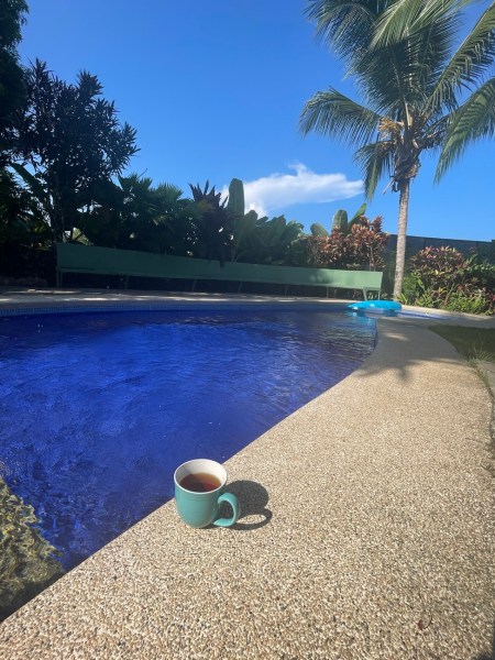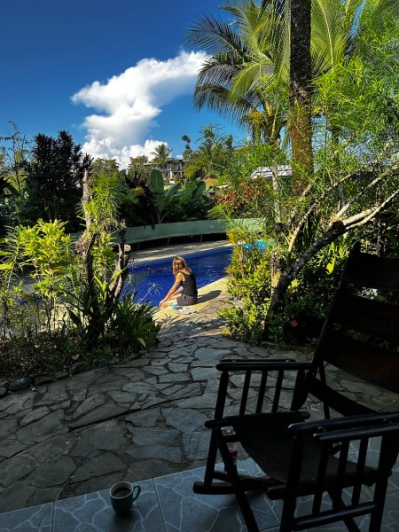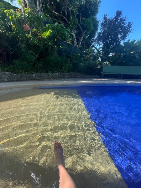 I had some tea and worked on a blog post, and then sat and dangled my feet in the pool for a while. There was a lot of bird activity in the trees all around us!