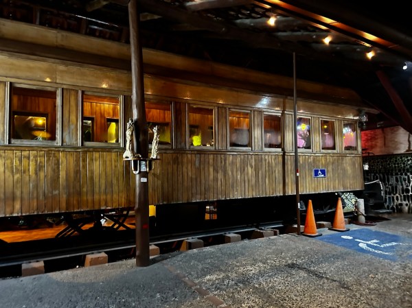 There are some tables inside this old train wagon! Cute. But we sat in the main outdoor area, right on the edge of a jungley area.