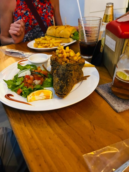 My dad got this lovely fish platter with the face and eyeballs still attached! Eek….