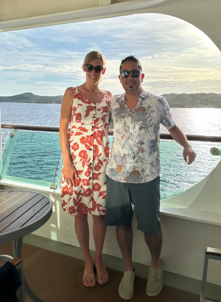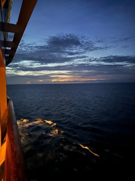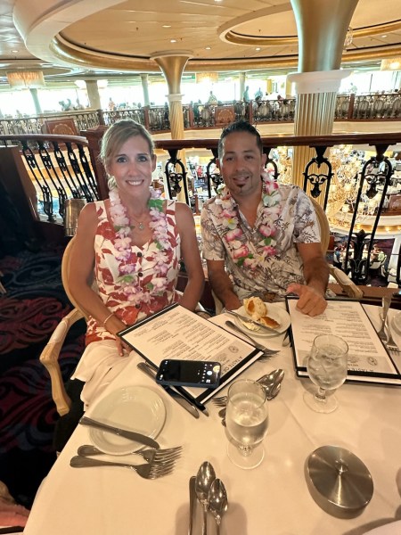 It was so beautiful out as we sailed away from Roatan in the early evening!! It was “tropical night” in the dining room, so we wore our tropical outfits we packed. 🙂