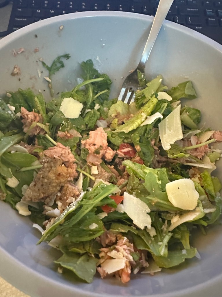 Lunches have been hit or miss- I have had an entire bag of microwave popcorn for lunch at least twice in the recent past… oops… but today I just finished this nice salad with tuna, pico de gallo and shaved parmesan:
