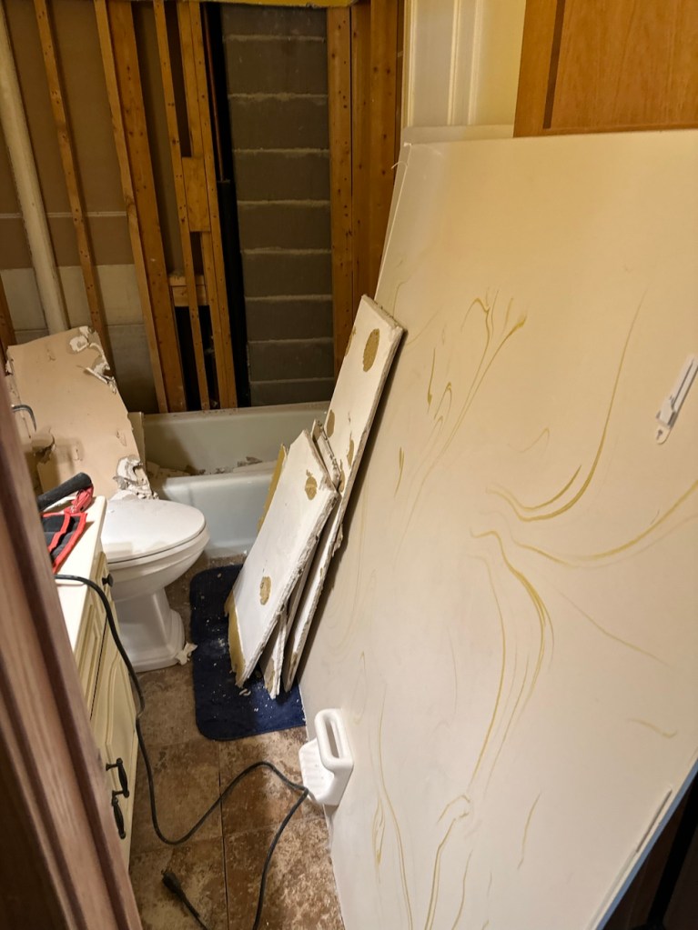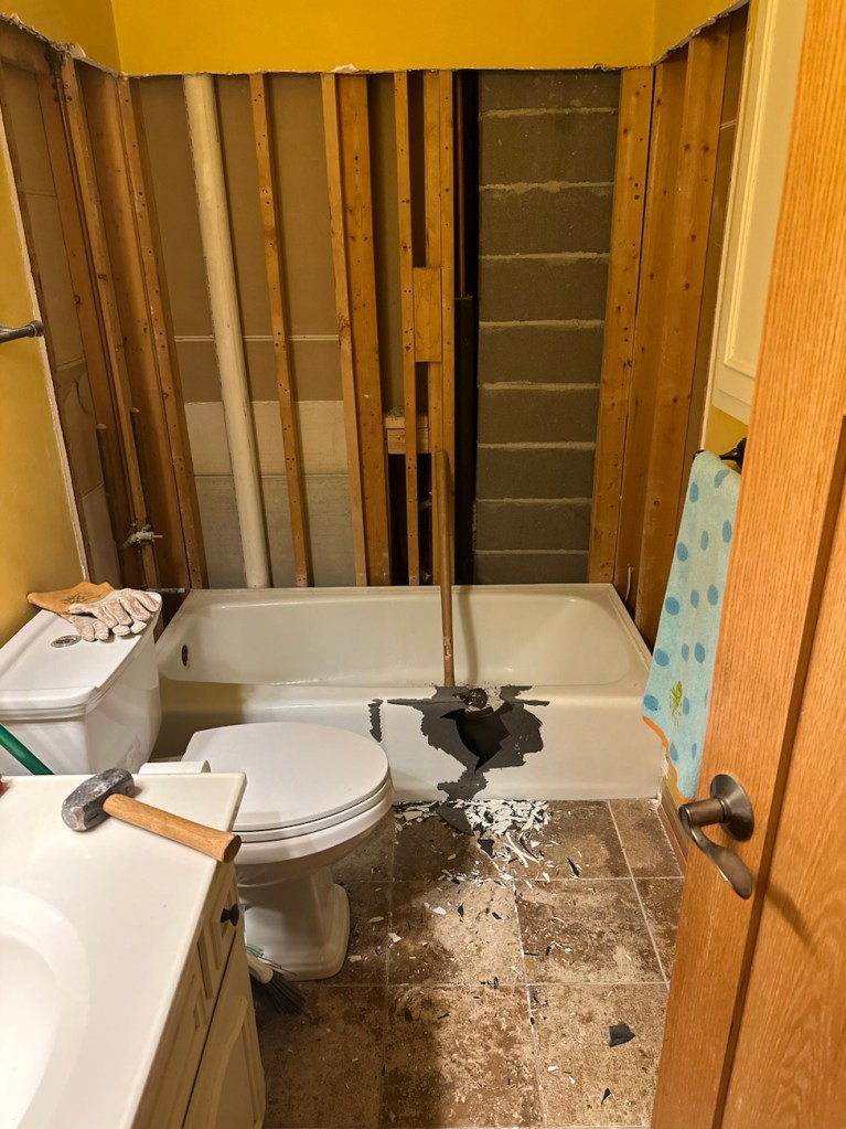 My parents came Friday night (the happily revolving door continues spinning… my mother-in-law and brother-in-law are still in town, too). The main reason my parents came now, too, was so my dad could help us get started on our bathroom remodel.