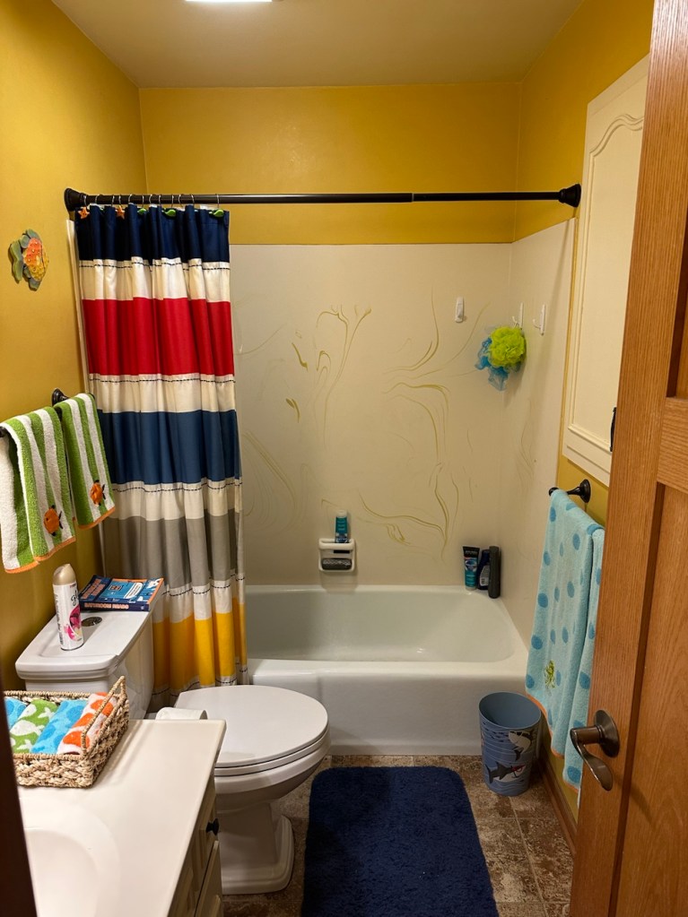 The plan is to modernize everything with a tile shower, new paint, new cabinets, new floor, new vanity, new sink, etc. etc. We won’t replace the bathtub and instead will put in a glass shower door. (My teen boys do not need a bathtub….).