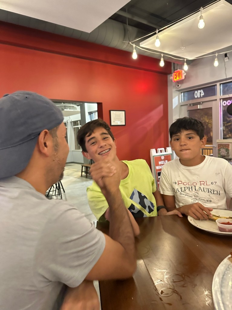 After dinner, somehow the boys started challenging people to arm wrestles. (This is a casual place and it was noisy/ had a bunch of kids in there, so this was not inappropriate.. lol!)