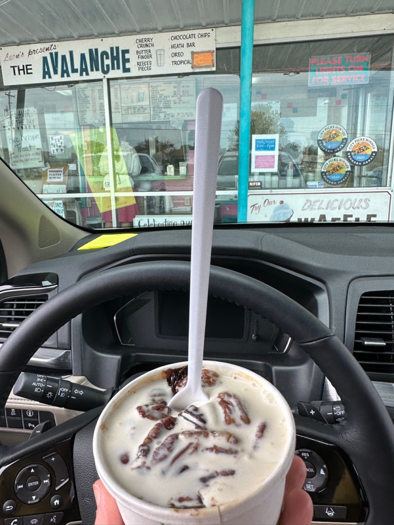 I, also, ordered a hot dog and a turtle sundae. Asher got a chili dog (I was a little nervous about him eating this in my new van…. it worked out) and a malt.