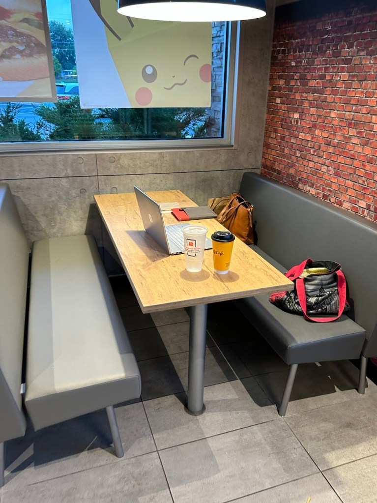 Ethan had to work this morning, so I rode along as he drove, and then settled myself in this little back corner of his McDonald’s for a while with a hot tea and a big ice water: