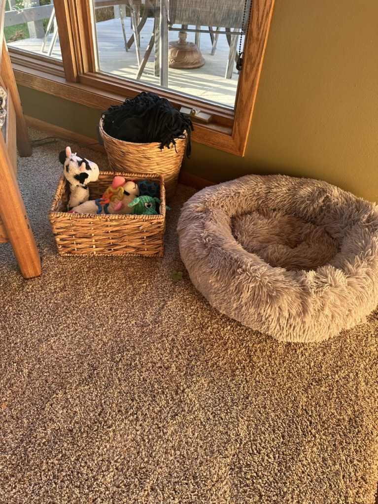 He now has 2 beds (one for the sunroom, and one to keep in my office, where eventually I hope he’ll hang with me during the day). He has a crate. A harness. A leash. Yard stakes. A collar. Food bowls. Food. Treats. The pig ears the lady said he loves. Toys. Blankets. And more.