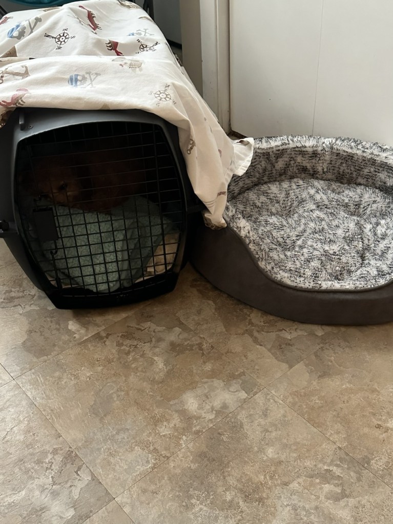 Here is now, snoozing away happily in my office in his crate (his “house”, as I’m trying to teach him it’s called). Working hard to make sure it’s a safe/happy space for him, not just a place he goes when we’re gone.