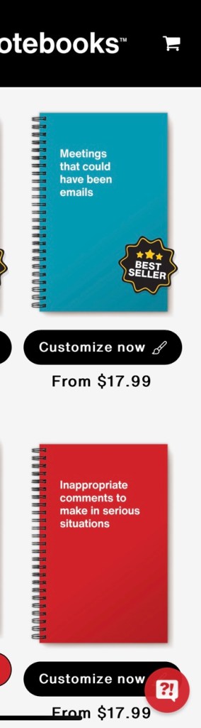 And, those notebooks are hilarious. I like how the “brilliant ideas I had while drinking wine” one is a bestseller.