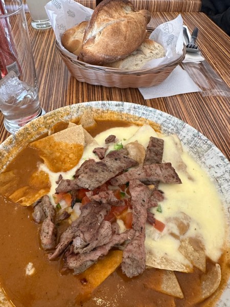 I got the arrachera chilaquiles- so it’s tortilla strips that were topped with beans, Gouda cheese, pico de gallo, and simmered in a spicy salsa. Super good!!