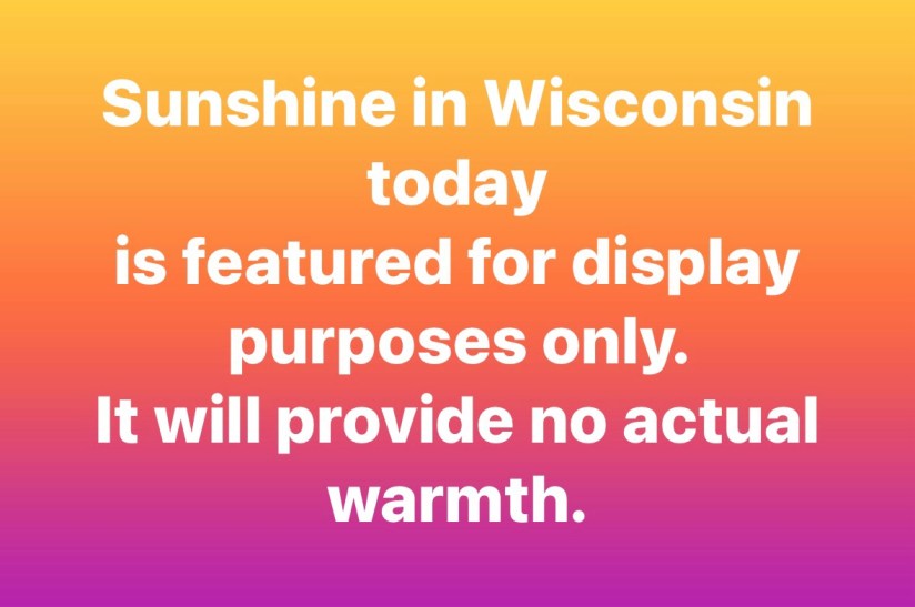 And this made me laugh. Saw this online yesterday morning as we woke up to below zero temperatures, but full sunshine! And it’s true- the sun literally provided no warmth at all. lol.