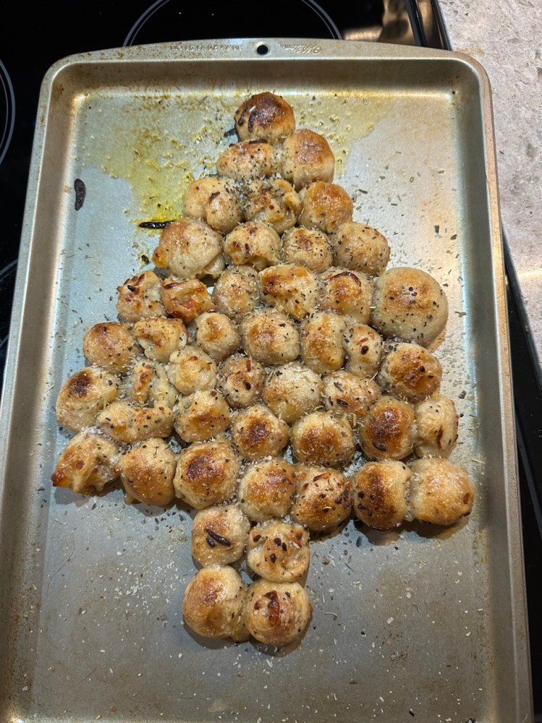We usually do snacky type foods on Christmas Eve, so that’s what we had- cheese and crackers, sausage, Chex mix, pulled pork sliders, shrimp + cocktail sauce, and the pizza rolls. Plus cookies.