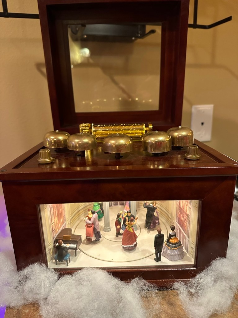 I think we were kind of all over Christmas movies or a lot of Christmas music at this point, but we did briefly turn on some Christmas tunes on my old fashioned music box. Isn’t it so cool?