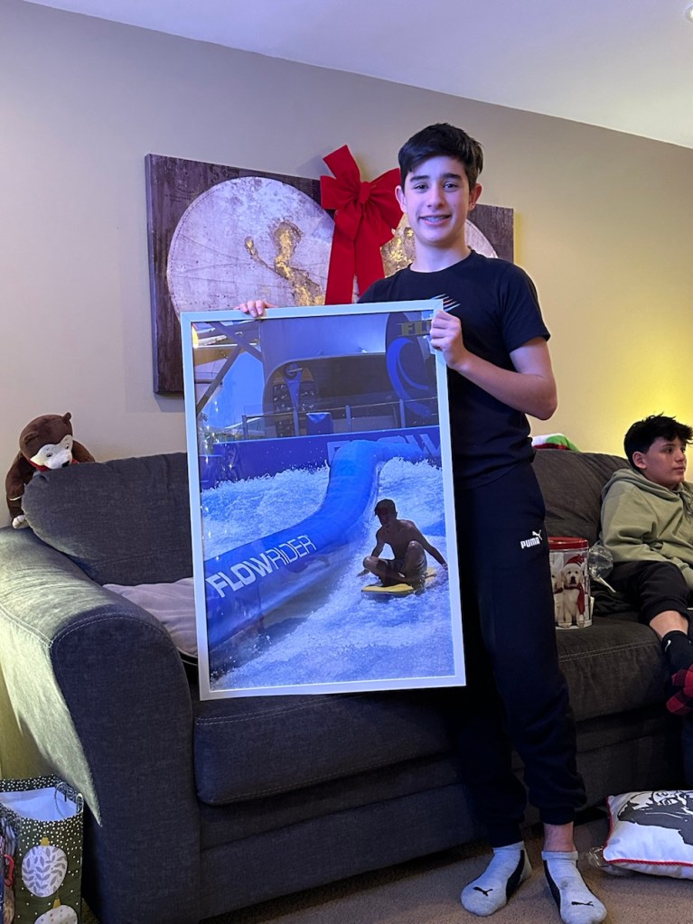 Ethan got this cool poster photo for his room from my parents- it’s a picture of him on the surfing Flow Rider on the cruise last summer. This was a favorite memory for him from the trip.