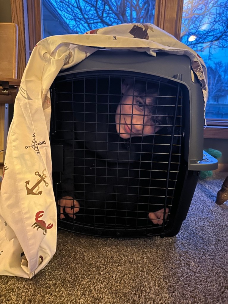 Asher getting crate trained. Parents of young kids… give it a try! LOL. just kidding….. 😉