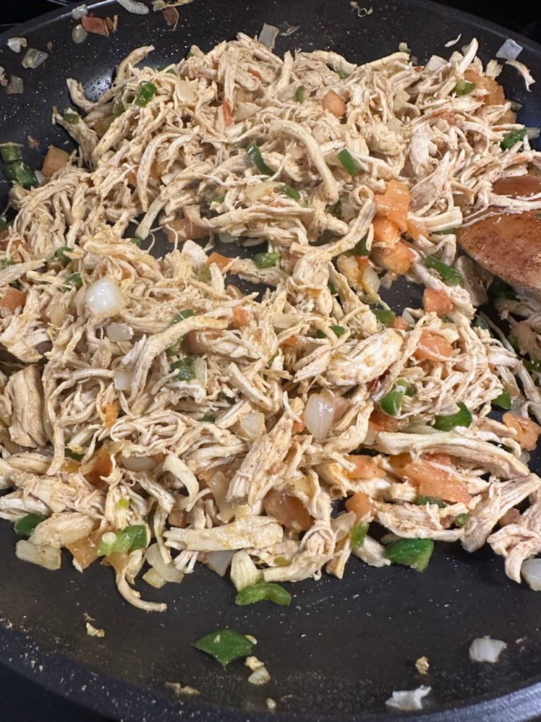 Basically it’s shredded, seasoned chicken sauteed with some onion, tomato and jalapeno peppers. Then you bake the hard shells for 5 mins to crisp them up, then add some refried beans in the bottom. Top with the chicken mix, then top with shredded cheese, and bake!