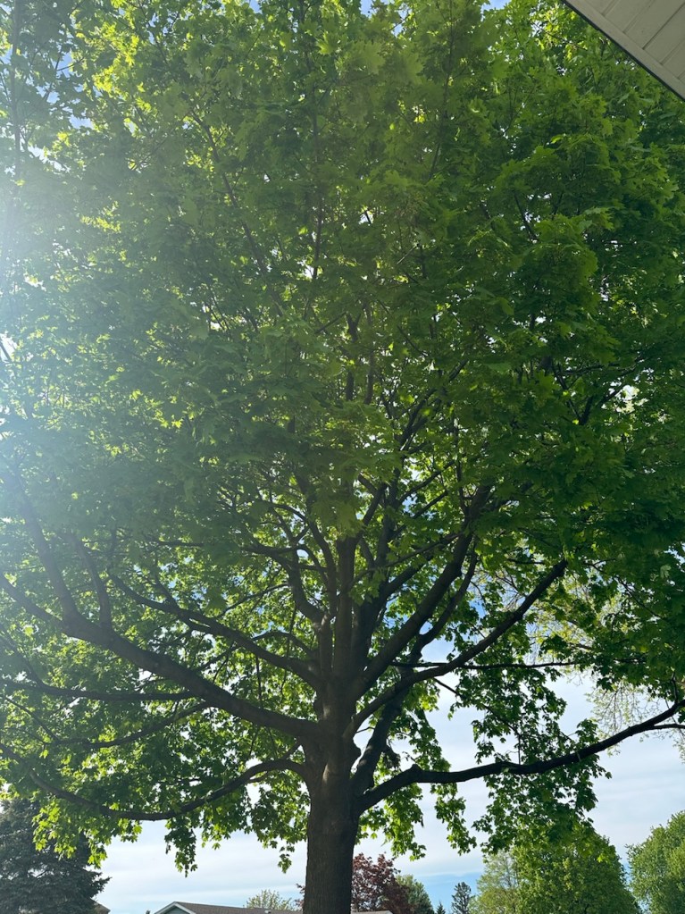 I was loving looking up at this big tree in our yard, really bloomed out now and full of lots of chirping birds: