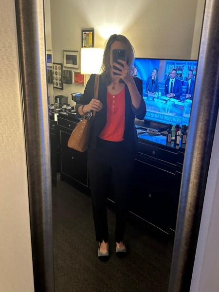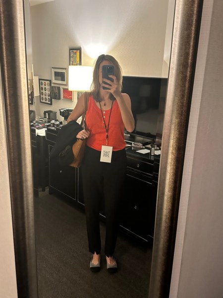 It was actually quite warm in the conference room so I barely even wore the cute jacket, though. Some people wore jeans to this final day, knowing they’d be traveling, but honestly? These particular black pull on dress pants feel like wearing sweatpants! They’re hard to see in the lighting. But they’re kind of a loose fit, ankle length and just super comfy. So I was happy to travel in them.