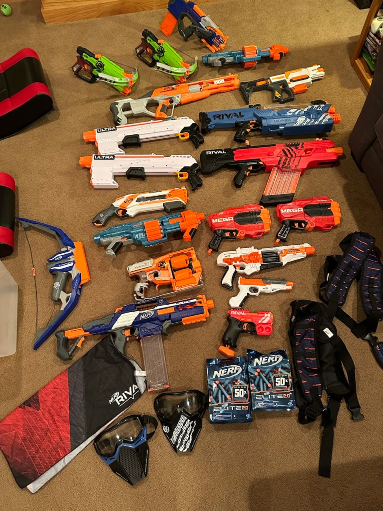 So, we have accumulated over 19 Nerf guns and accessories.