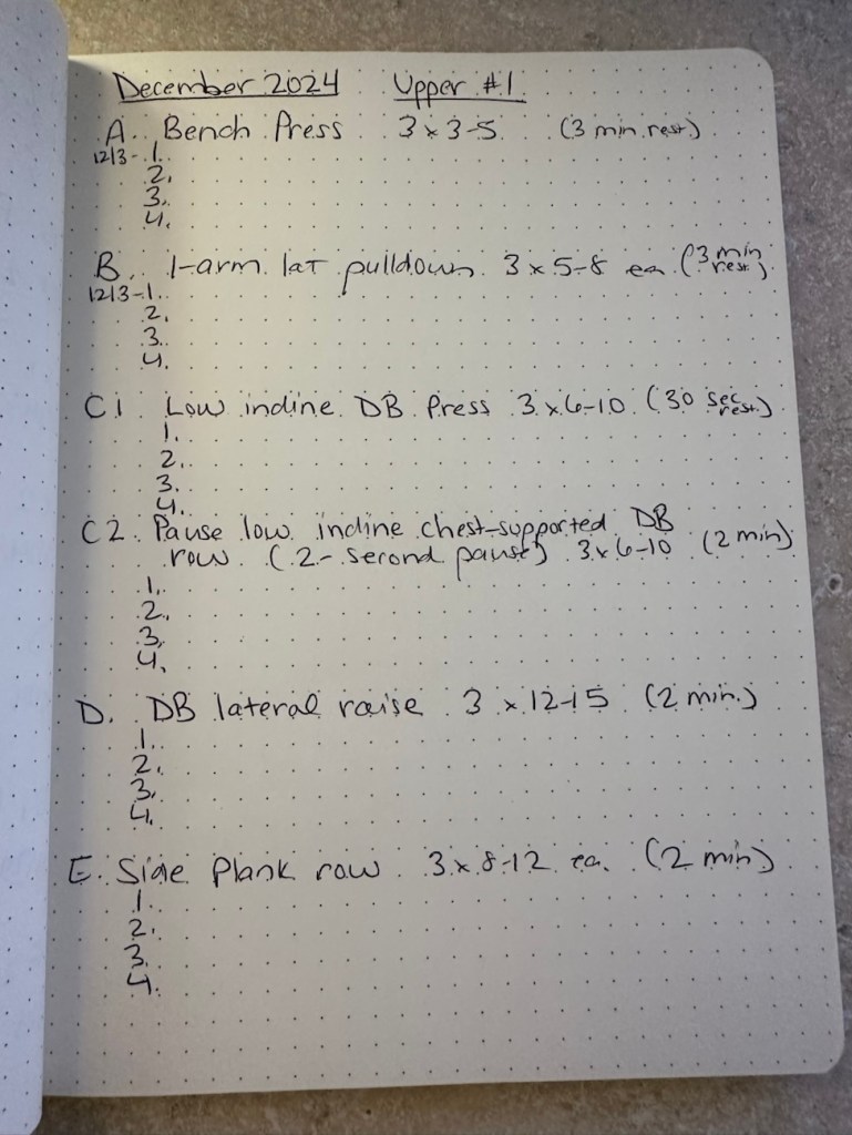 Got my new tracking page all set up in my notebook for workout #1. I do each of my 4 workouts (Upper 1 + 2, Lower 1+ 2) once per week for a month. So I recorded my weights and sets here for today, 12/3. Next week on line 2 I’ll put 12/9, etc.