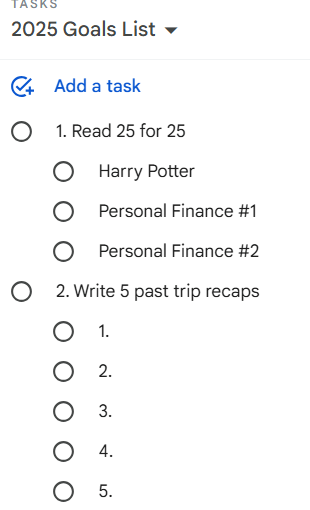 I will track the Harry Potter + Personal Finance goals in my Goals List in Google Tasks: