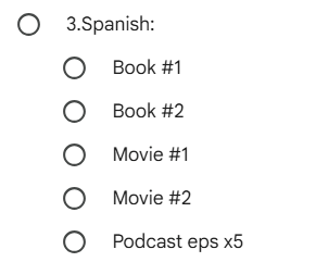 3. Read 2 books in Spanish, watch 2 movies in Spanish and listen to 5 podcast episodes in Spanish.