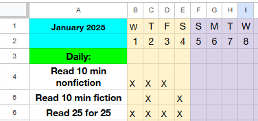 How I’ll Track: On my Habits tab in my Time Log spreadsheet. (Main goal is to hit the 25 most days- I don’t really care about the fiction vs non-fiction part. Just recording that for my own “interest”, lol.)