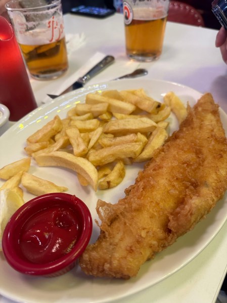 Many places already weren’t serving food at 9:30 pm on Sunday night… but we managed to find this diner-looking place right across from the tube station called “Jack the Chipper”. 😆 (Clearly capitalizing on the location in Whitechapel!) It said its speciality was fish and chips. Perfect. It was warm and they had food.