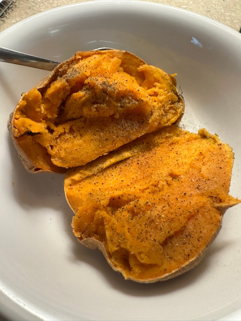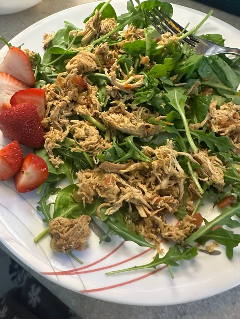 L: salad + more chicken, strawberries, sweet potato with salt and pepper only.